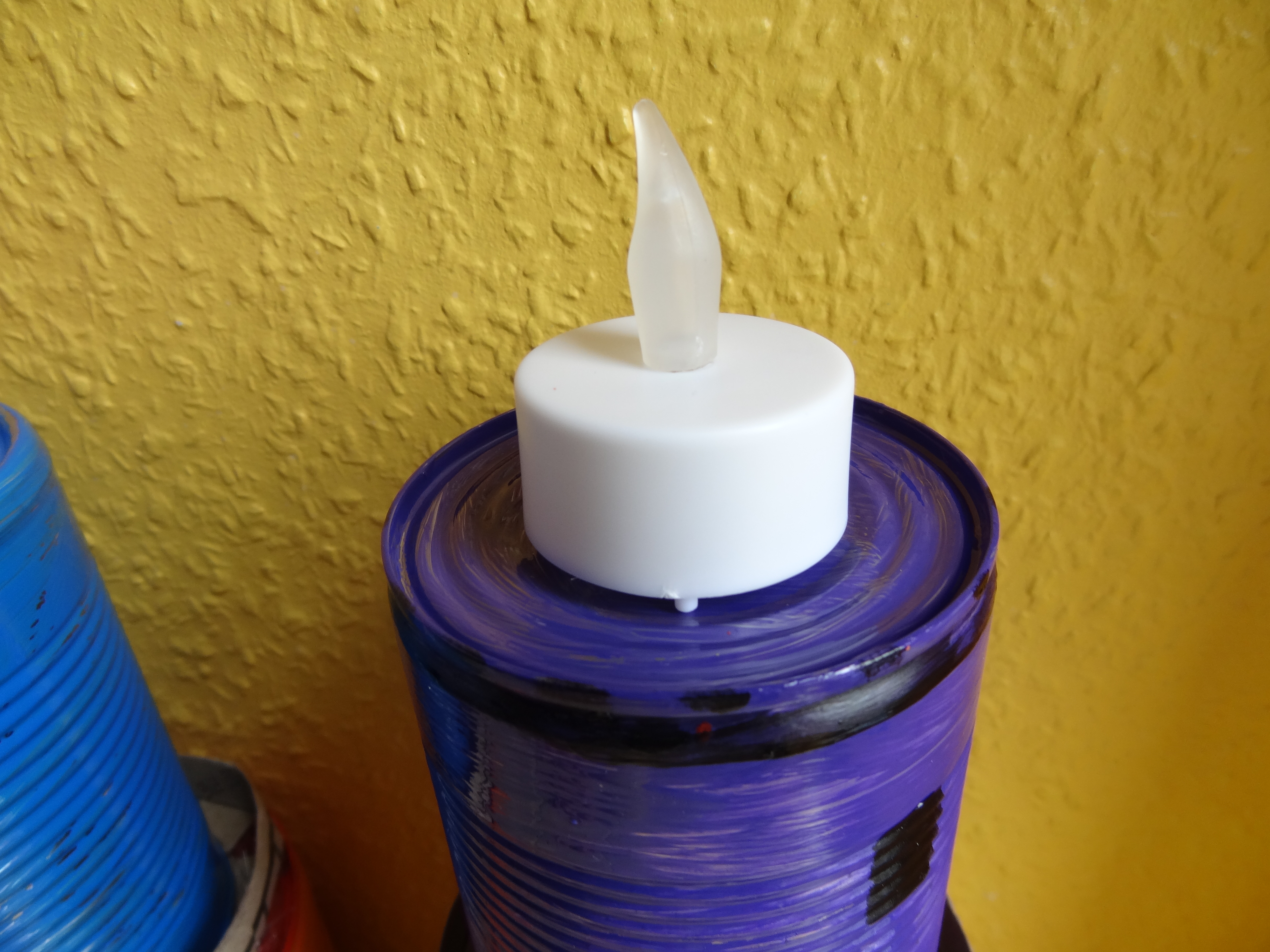 En haut du phare sous le pot de yaourt, nous avons mis une petite lampe LED qui claire comme une vraie flamme donc l'effet est assé sympa dans la nuit...
