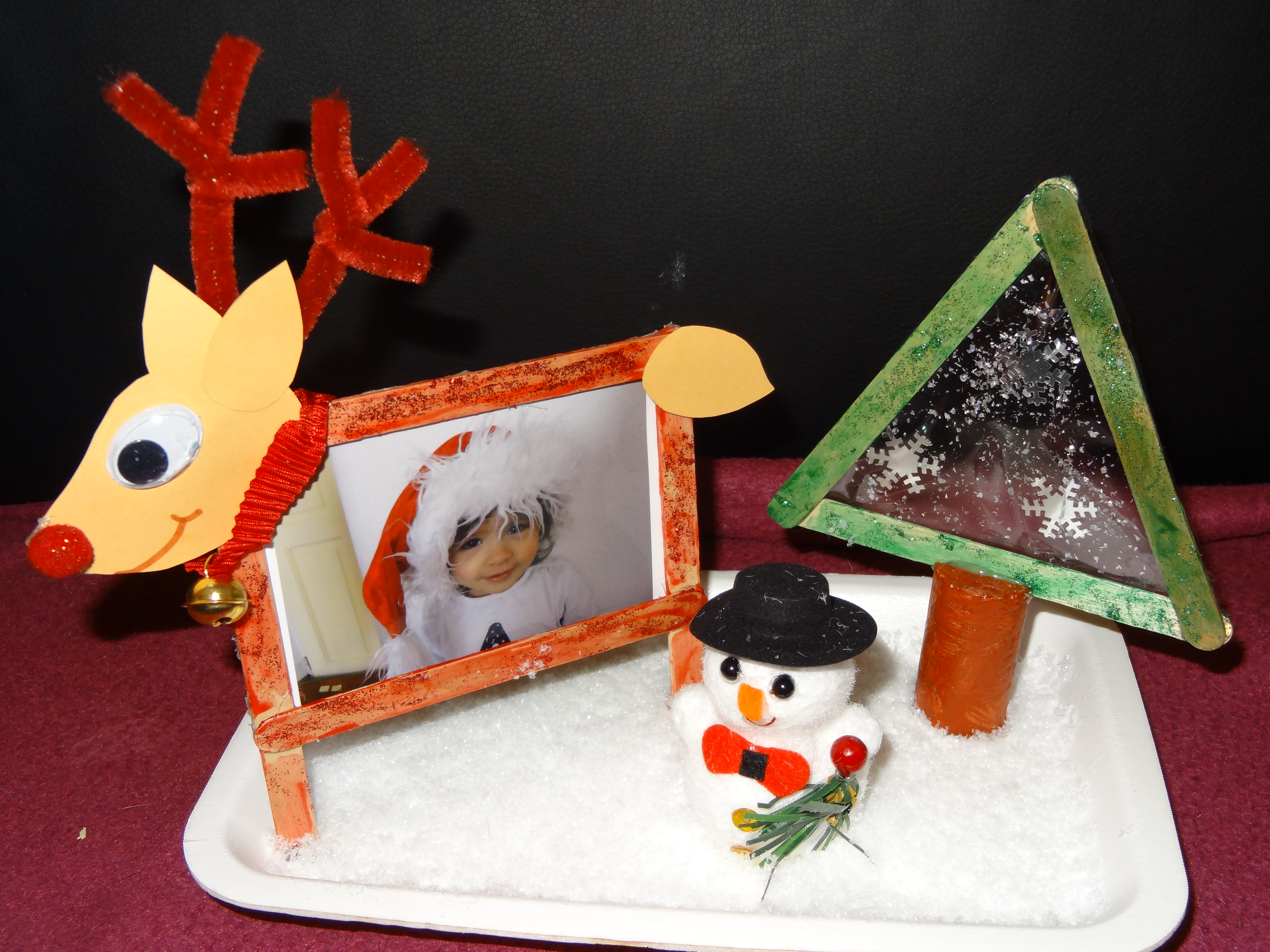 Nounou a collé tous les éléments dans une barquette de polystyrène et après avoir mis de la colle liquide on a soupoudré de fausse neige...