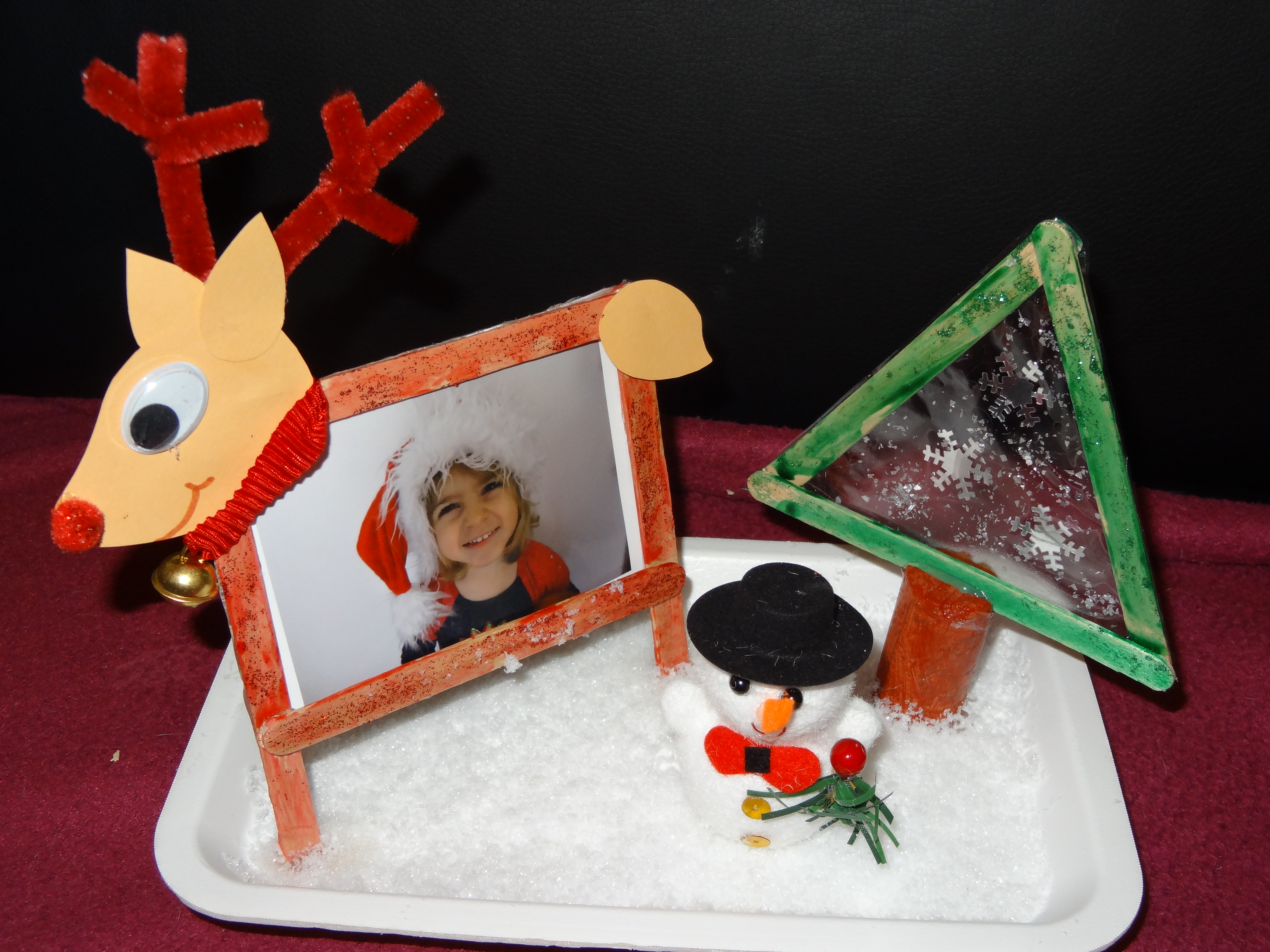 Pour le renne, nounou a simplement découpé des morceaux de carton pour faire la tête et la queue puis a fixé des cures pipe pour faire les bois, un mini pompom rouge pour le nez, un oeil mobil, un grelot autour du coup (récupération des lapins en chocolat de Lindt à Pâques)et une photo des filles avec le bonnet du Père-Noël...