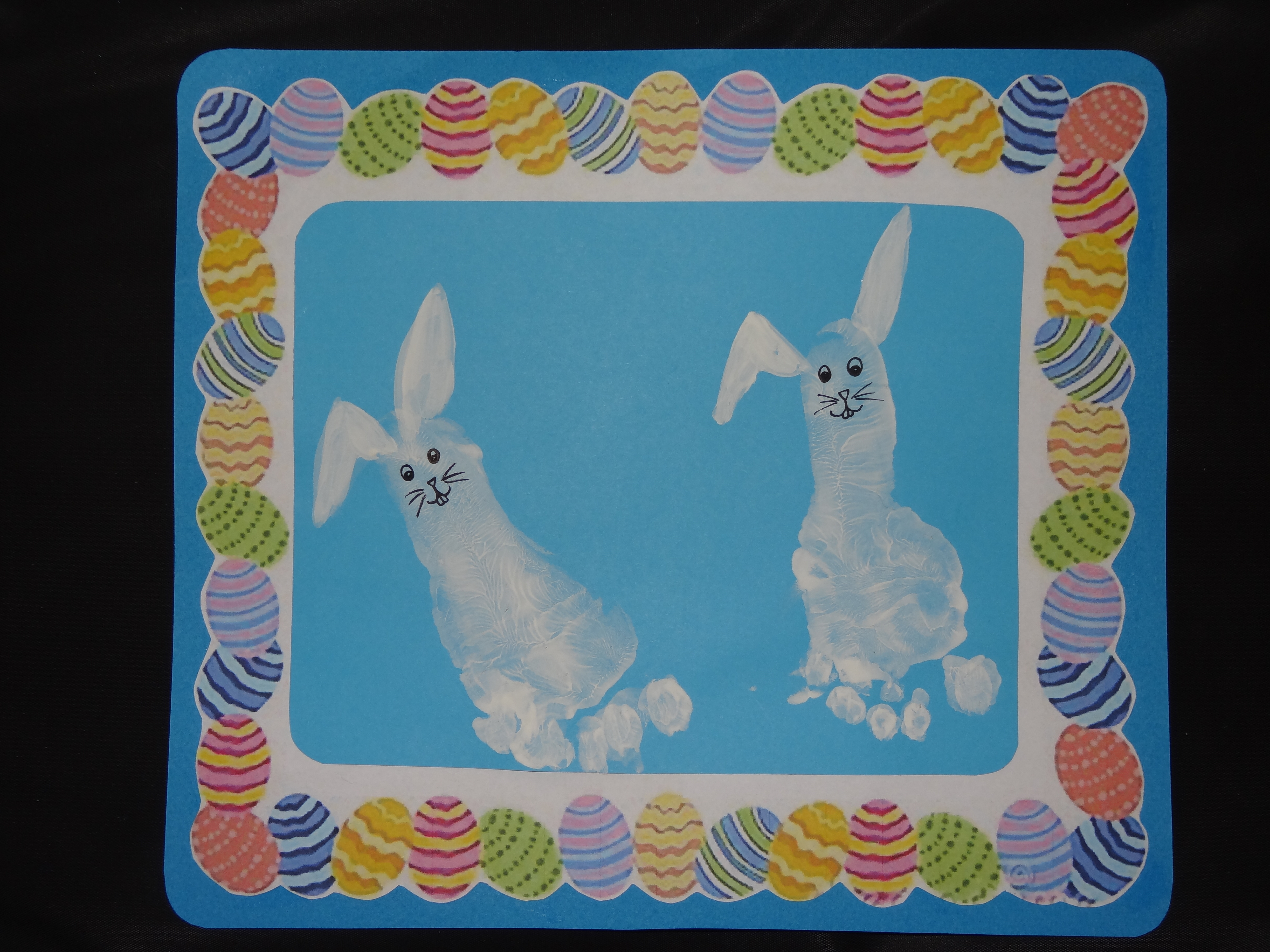 Max a fait des empreintes de pieds en peinture blanche sur une feuille bleue et nounou a ajouté des oreilles pour faire de beaux lapins...