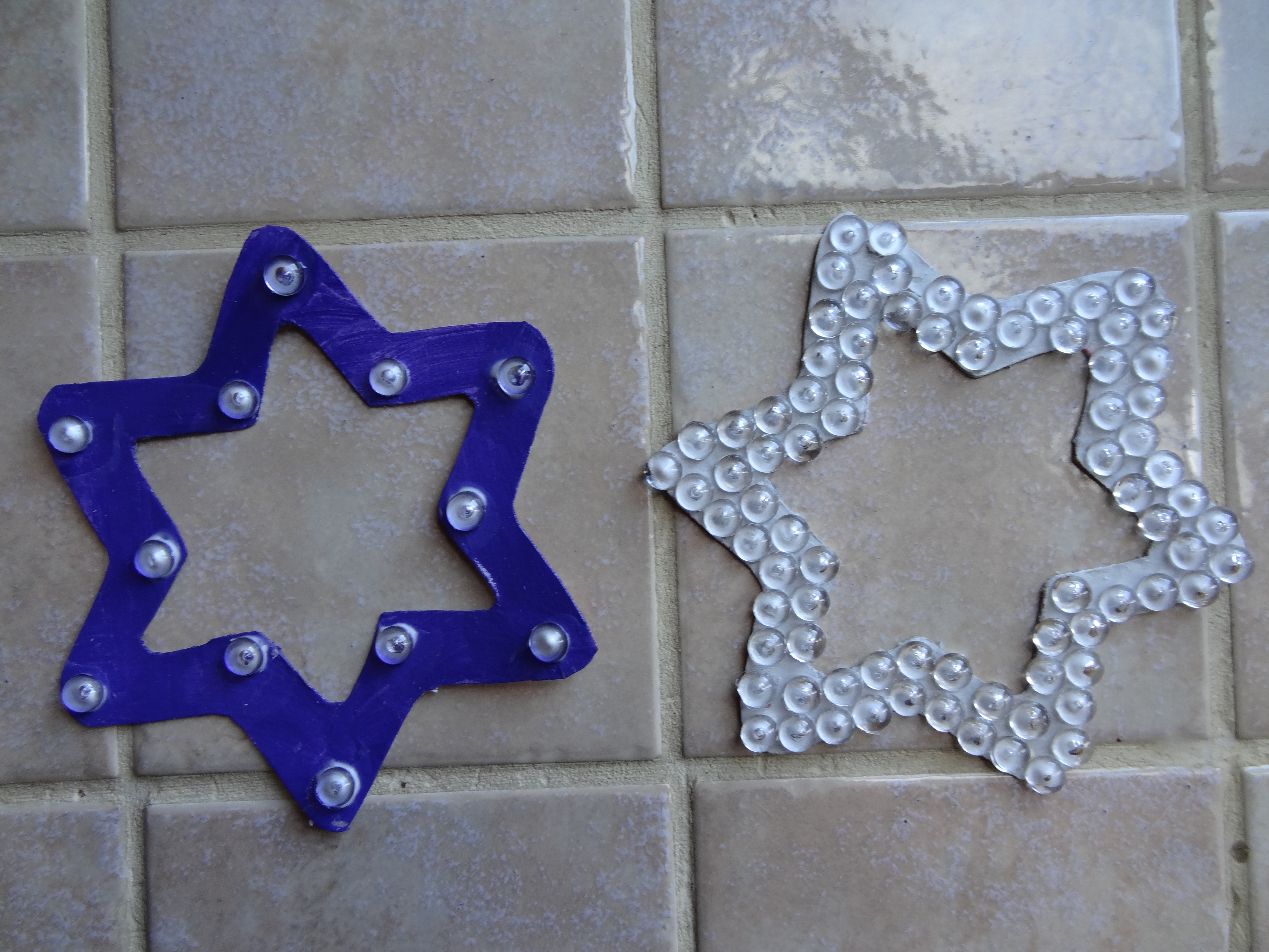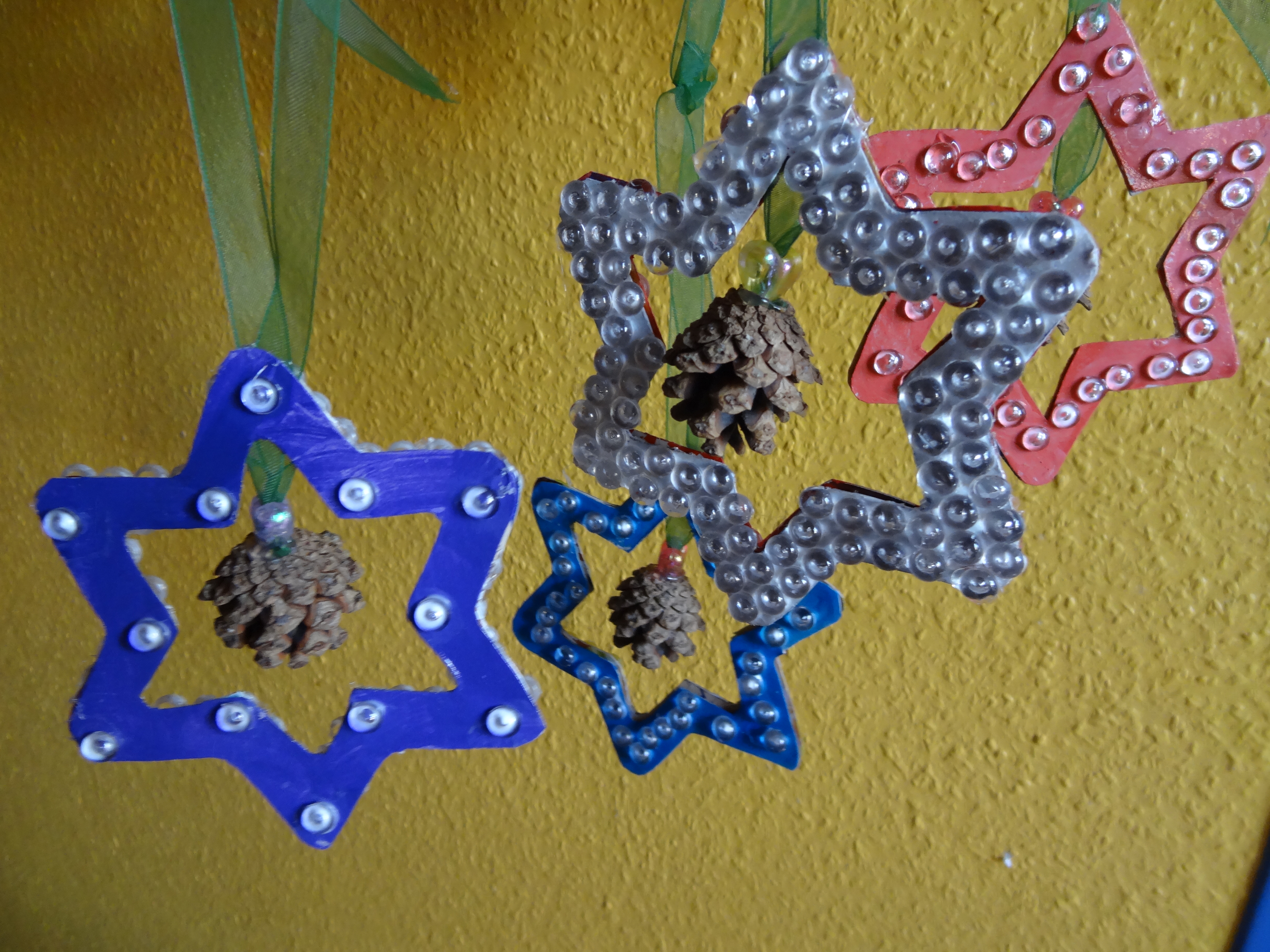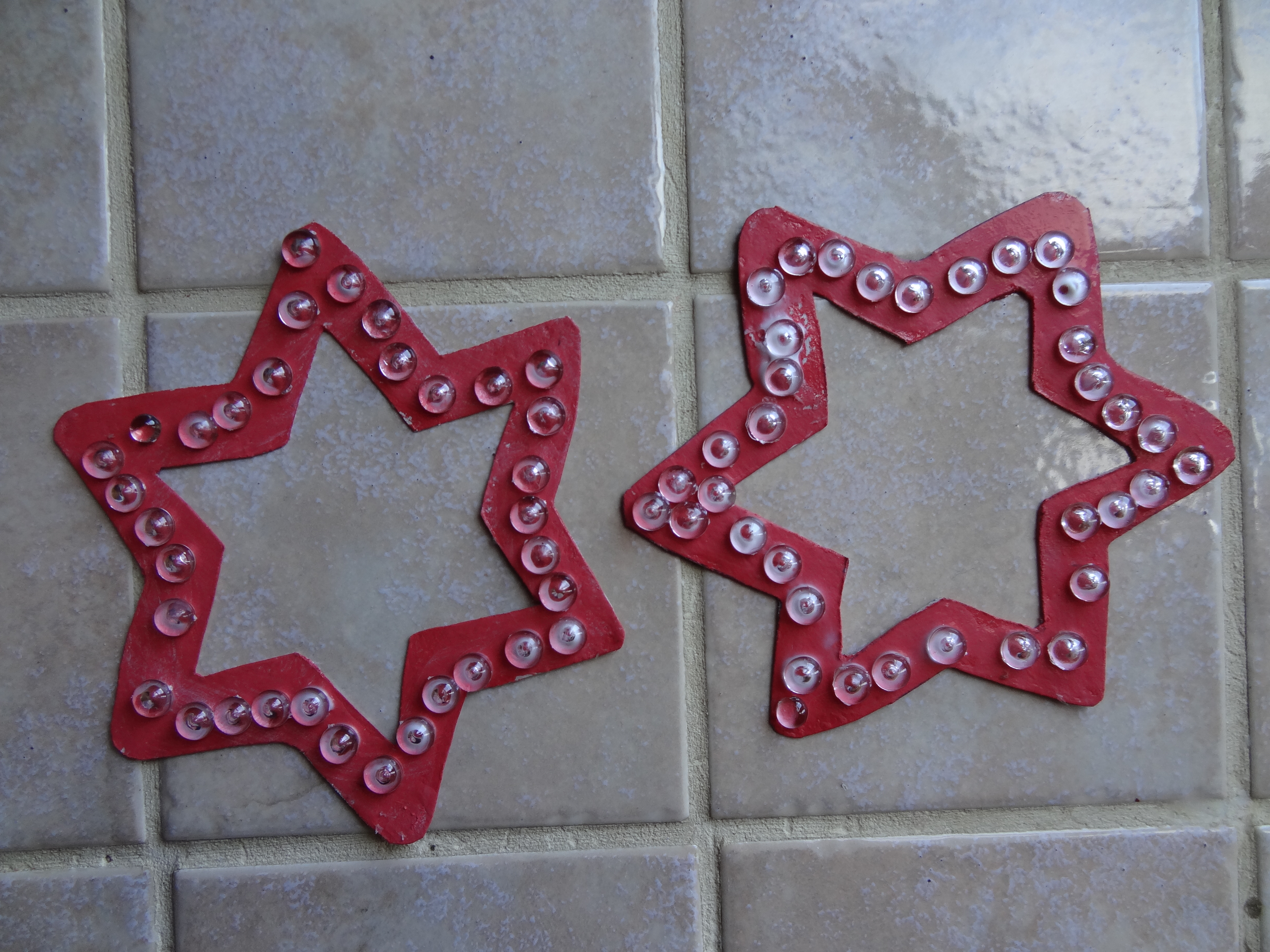 Puis mes "lutins" ont peint chacun 2 étoiles et ont collés des strass ( des moitié de boule transparente) sur chaque étoile...