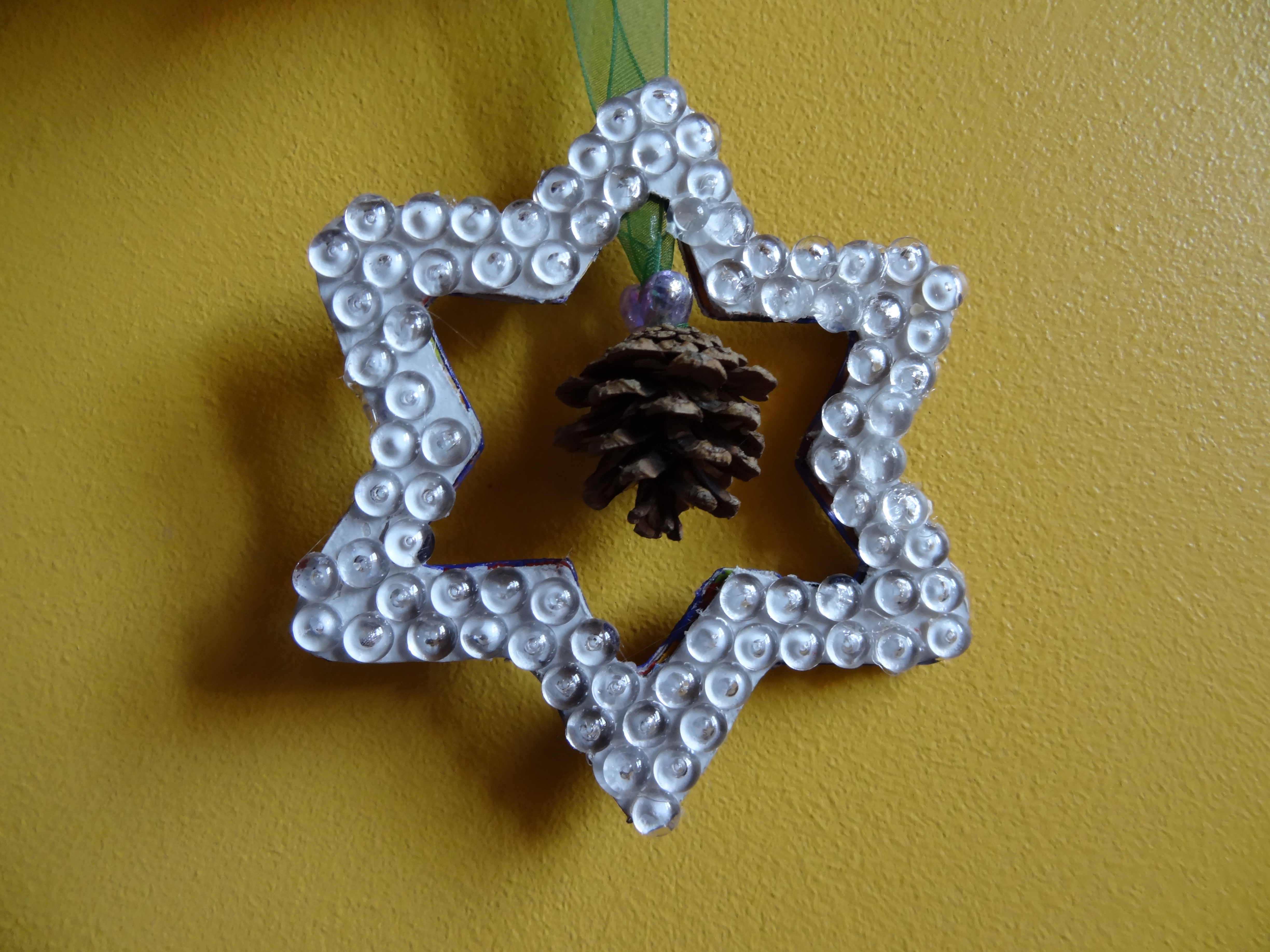 J'ai ensuite collé les 2 étoiles ensemble en passant au milieu un ruban auquel j'ai collé une perle en forme de coeur et une pomme de pin...