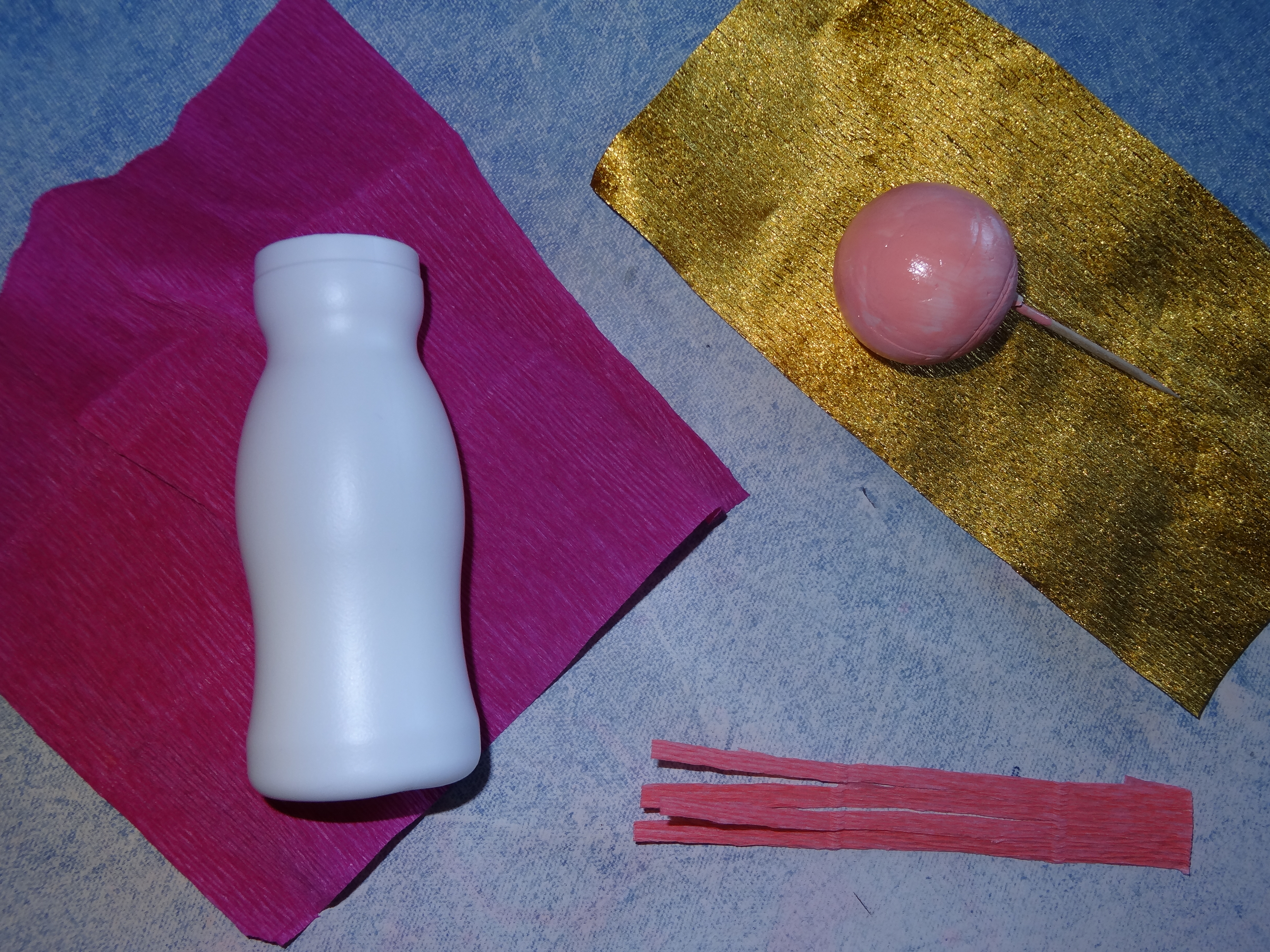 Pour cela, j'ai sortie tout mon stock de papier crépon (+ de 10 couleurs différentes), des petites bouteilles de yaourt à boire et des boules de polystyrène...