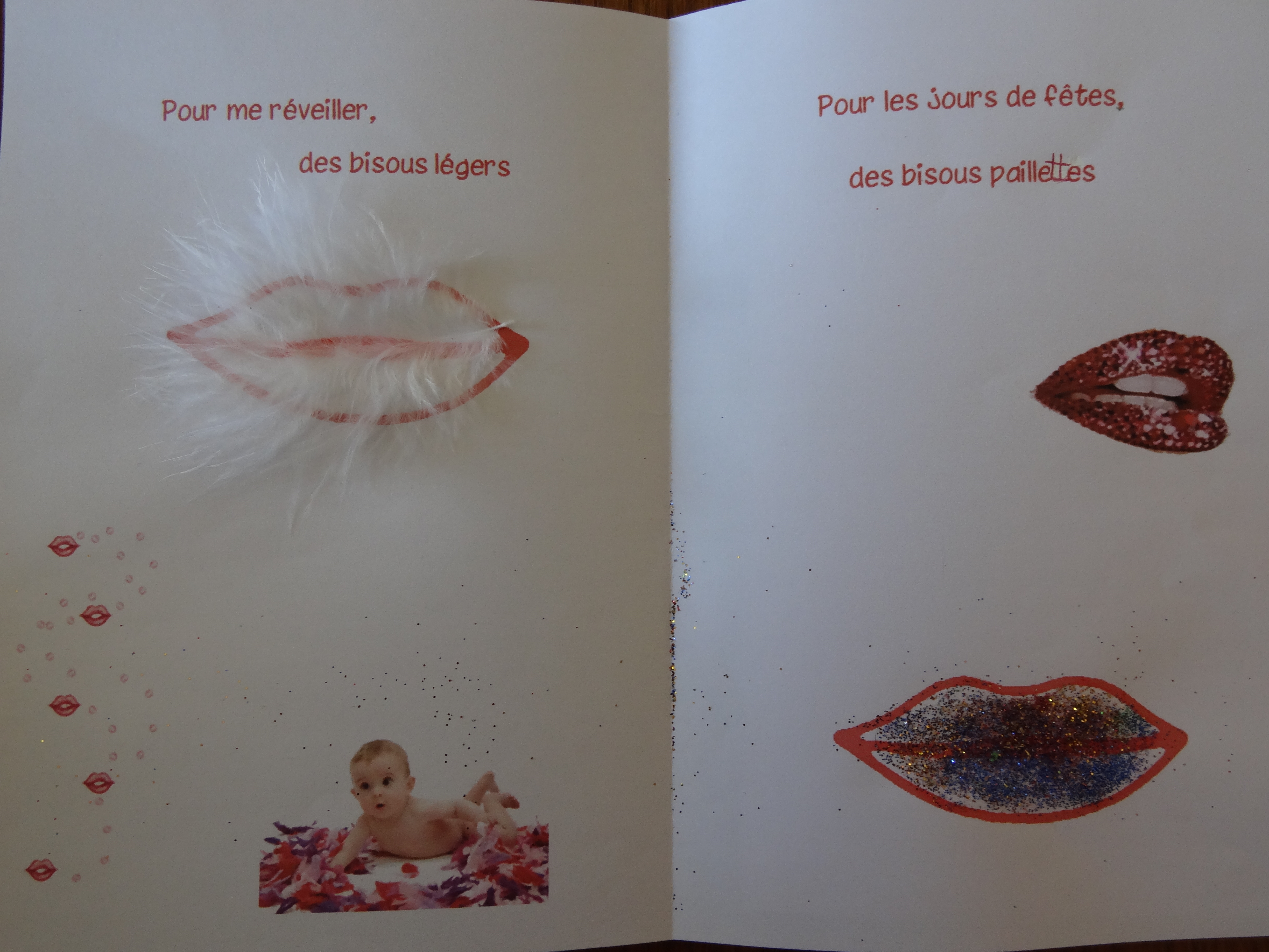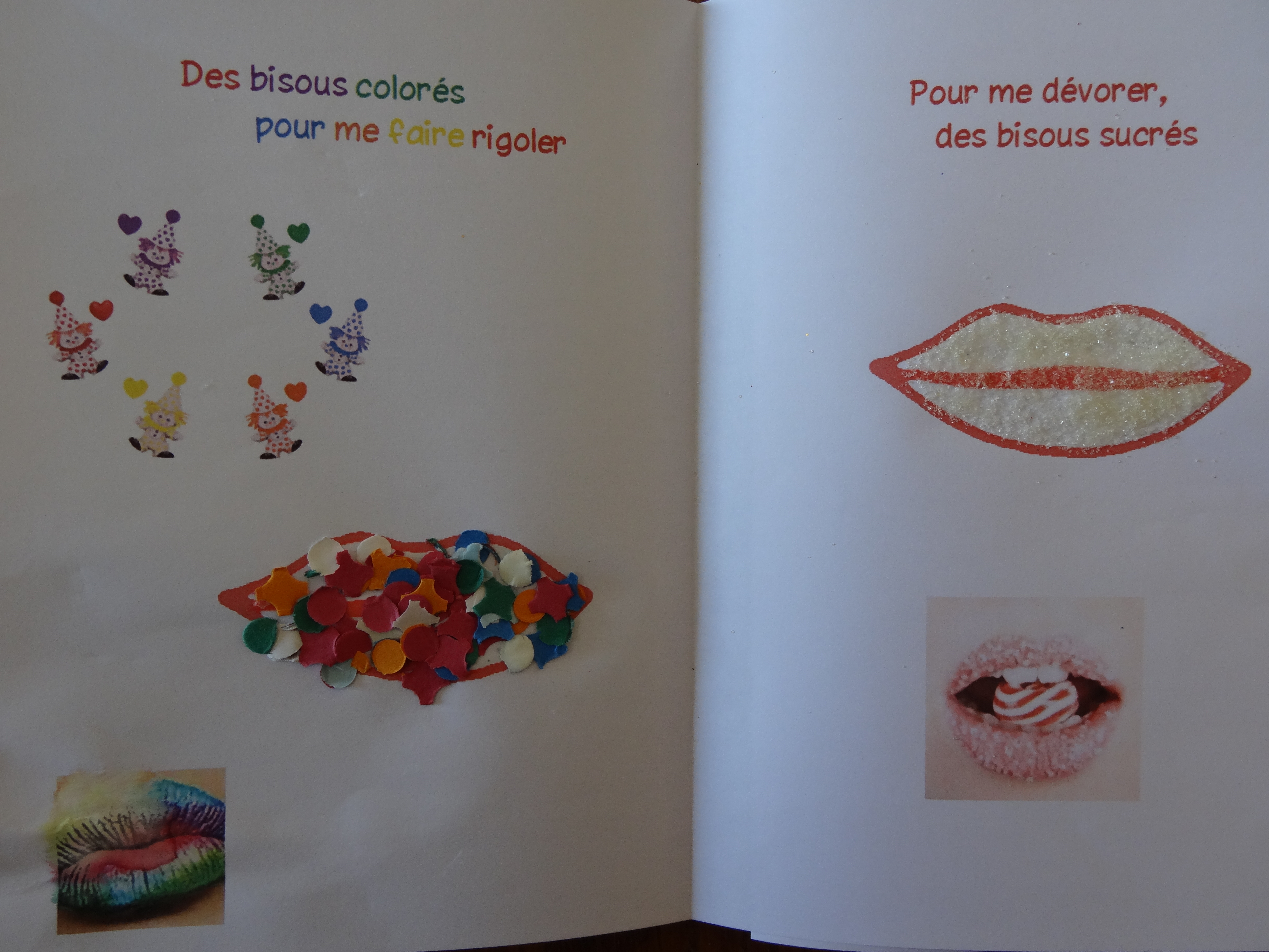 Sur chaque page il y a le dessin d'une bouche que j'encollais puis Léopold y collait différentes choses en rapport avec la phrase...