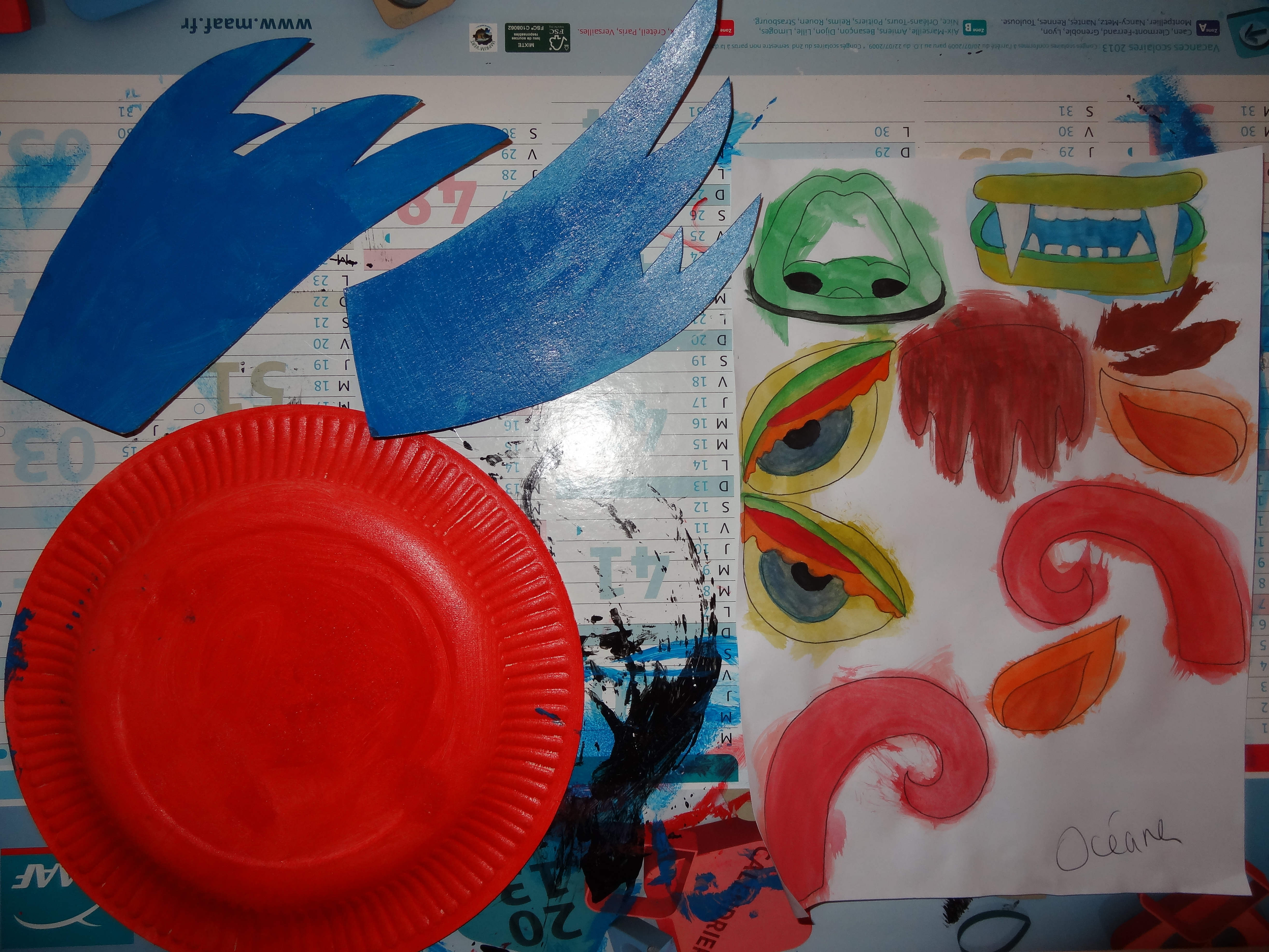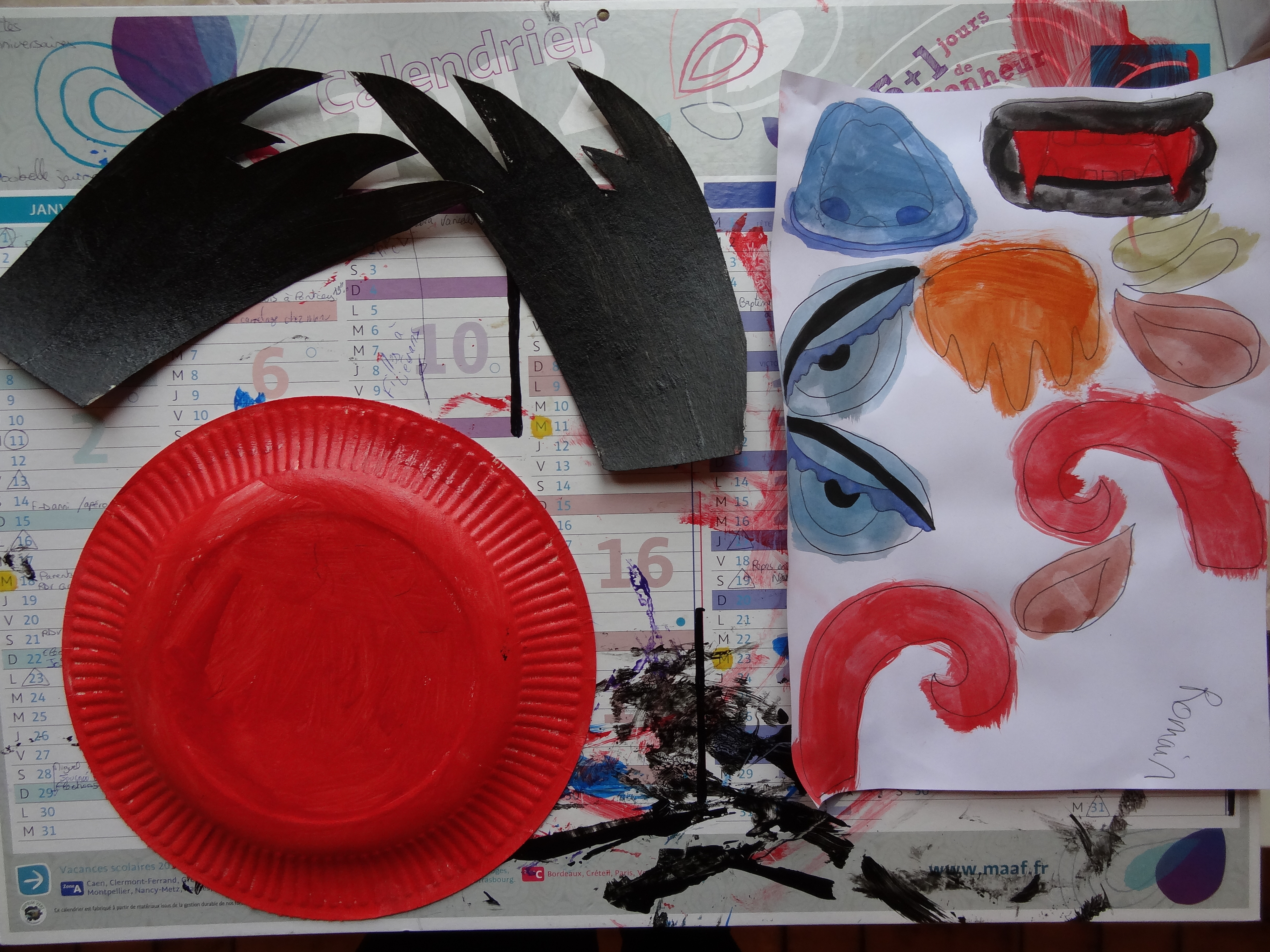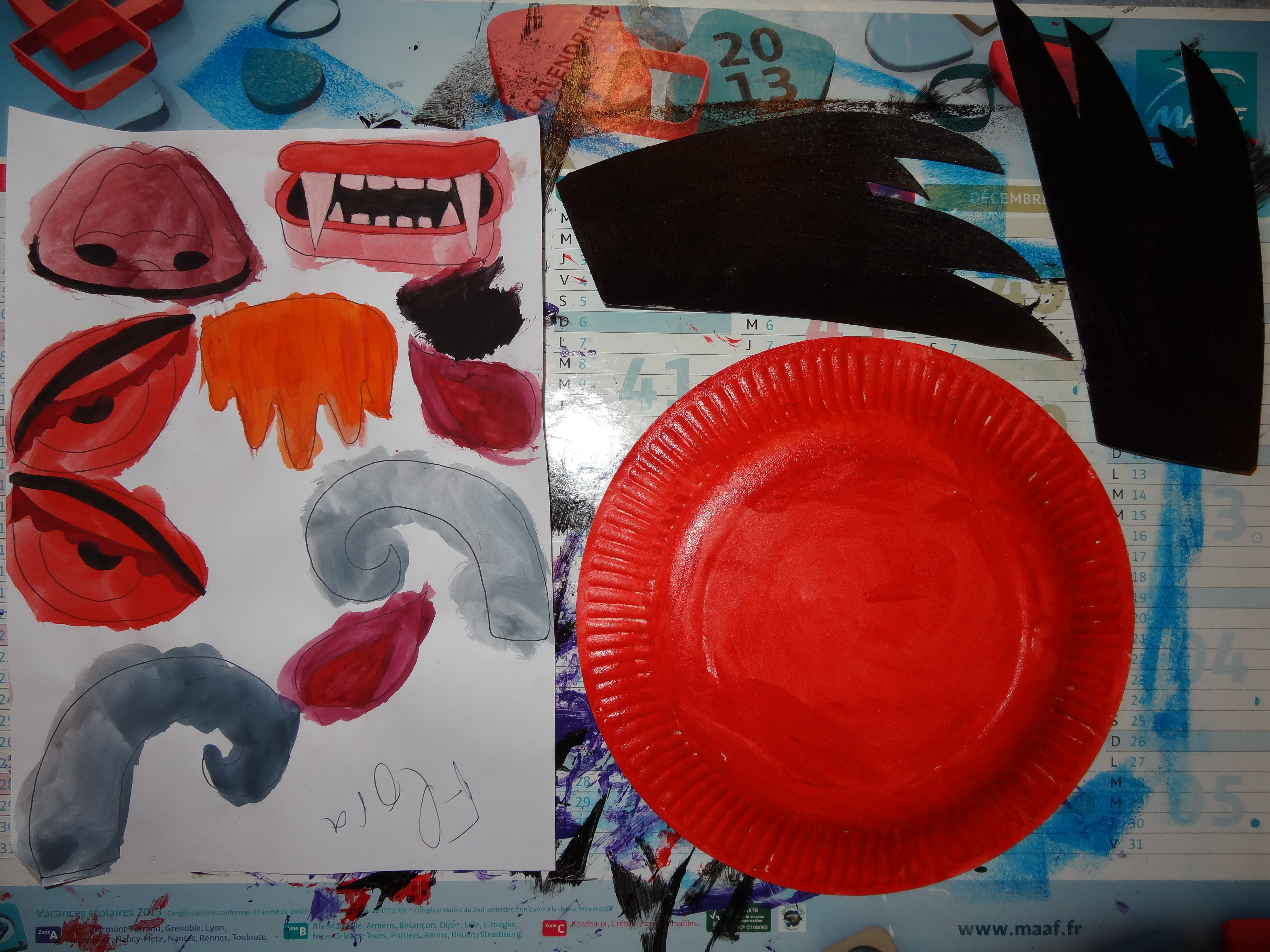 J'ai fait peindre aux enfants des assiettes en carton en rouge puis ils ont peint comme ils le souhaitaient les différentes parties de la tête que j'avais préalablement dessiné sur une feuille et sur du carton fin d'emballage...
