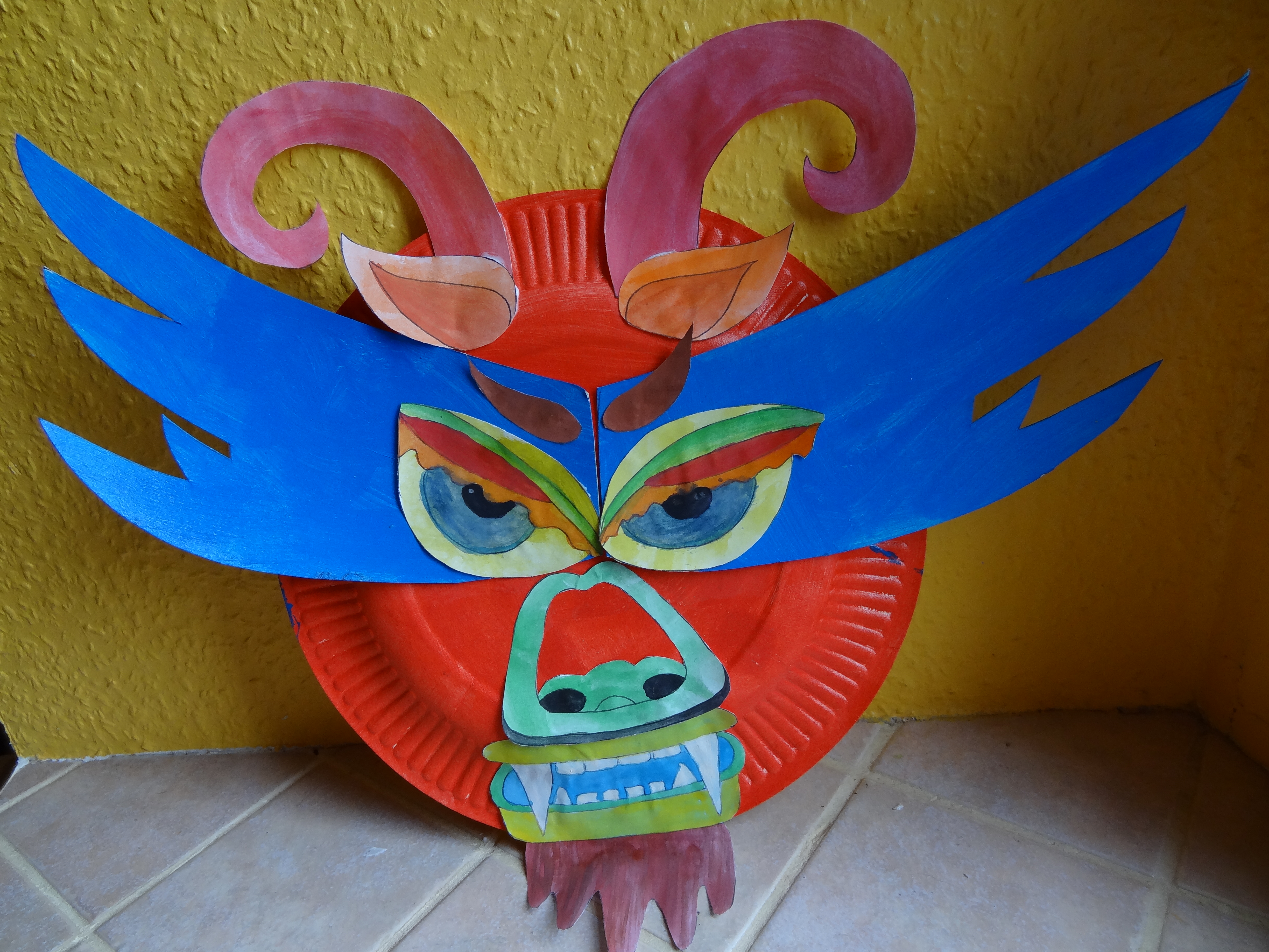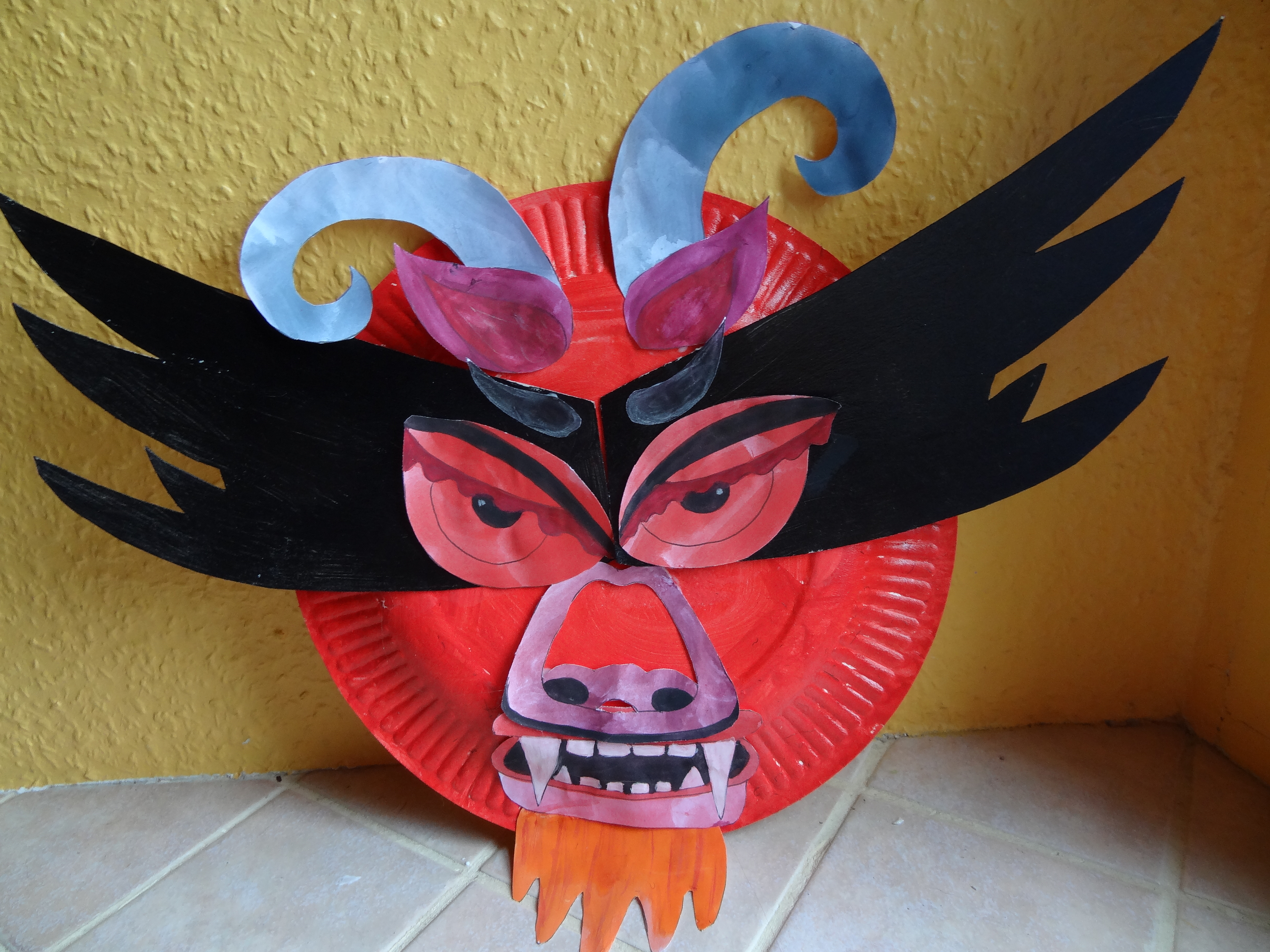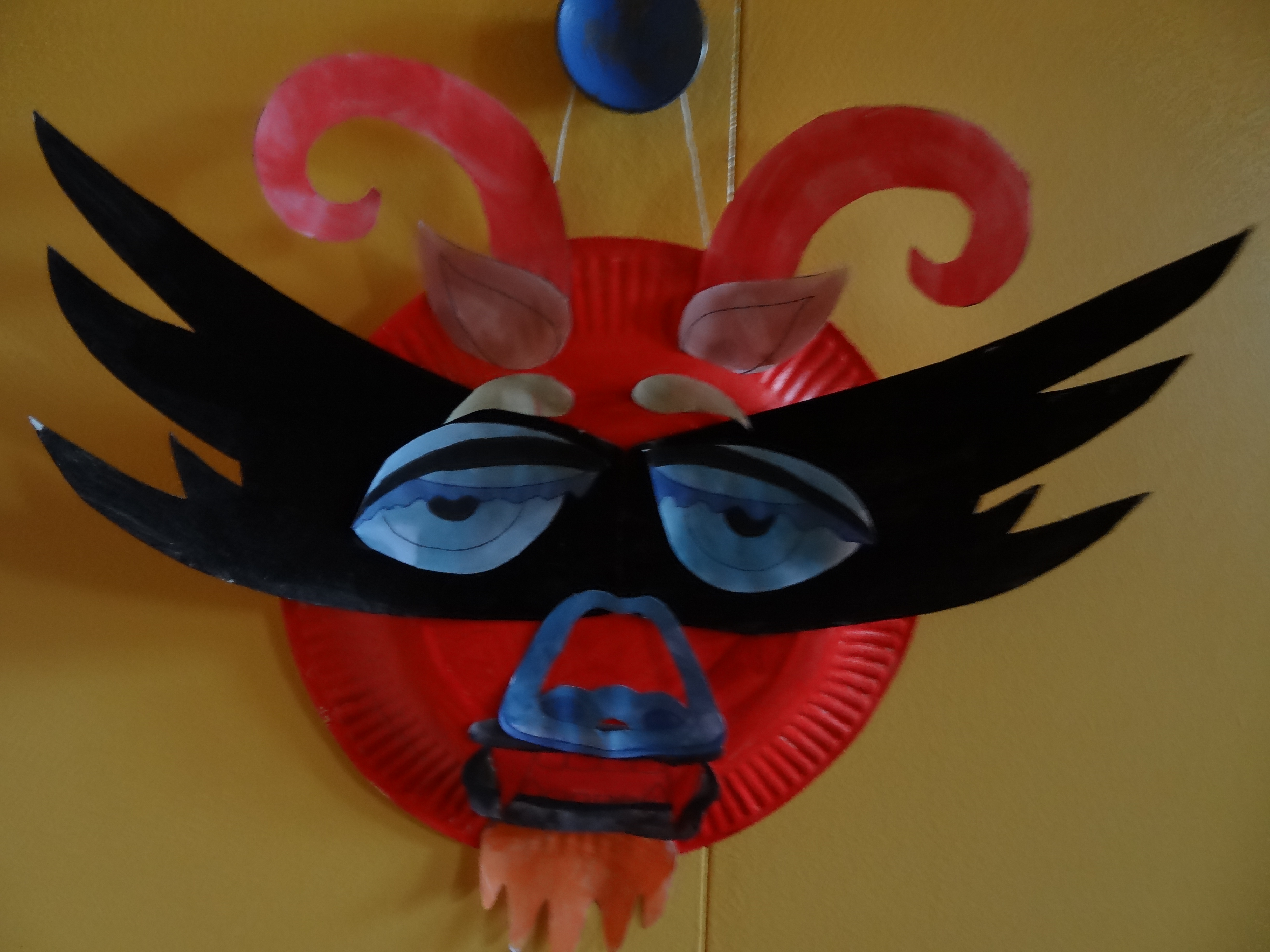 J'ai fait peindre aux enfants des assiettes en carton en rouge puis ils ont peint comme ils le souhaitaient les différentes parties de la tête que j'avais préalablement dessiné sur une feuille et sur du carton fin d'emballage...