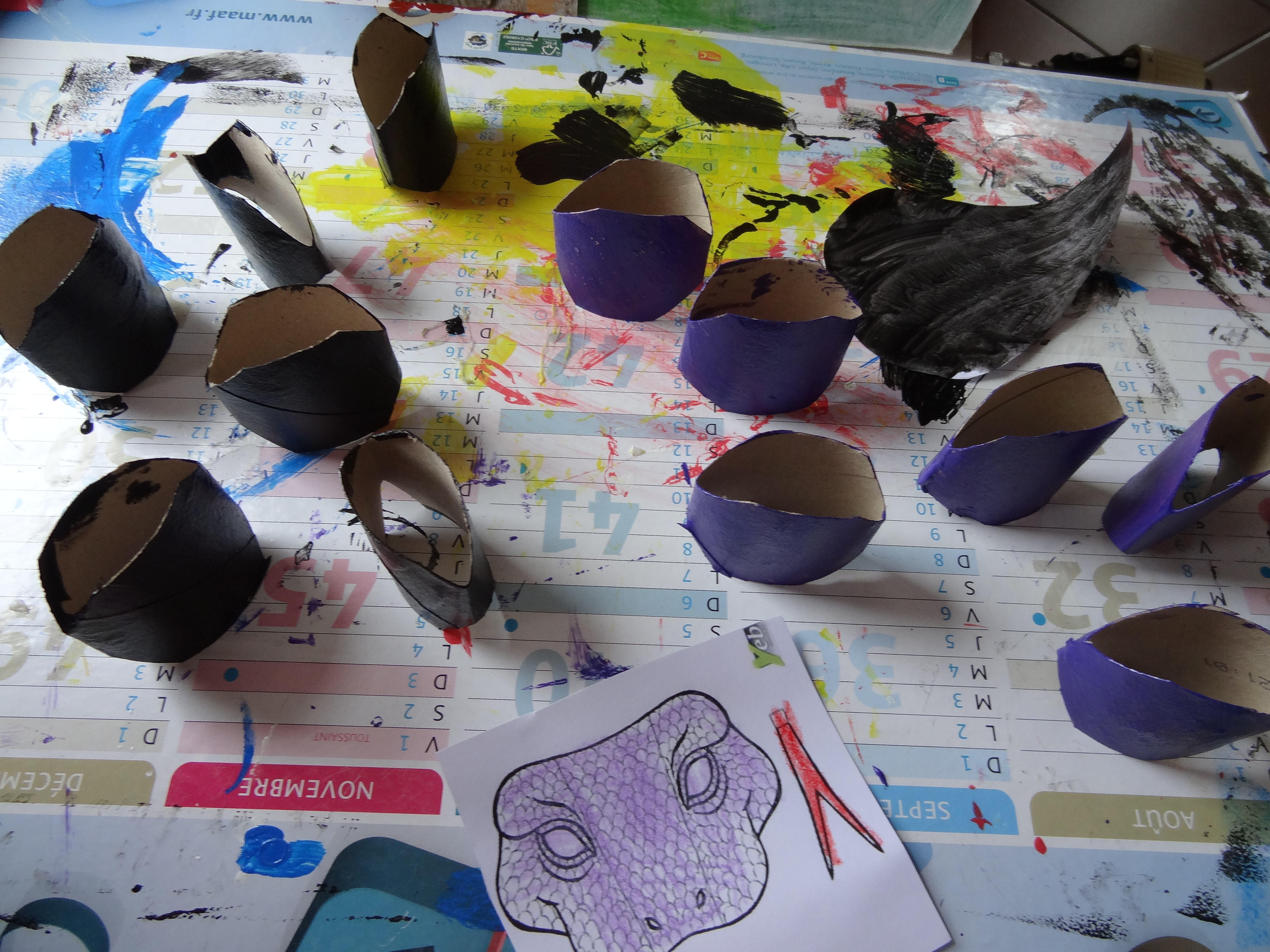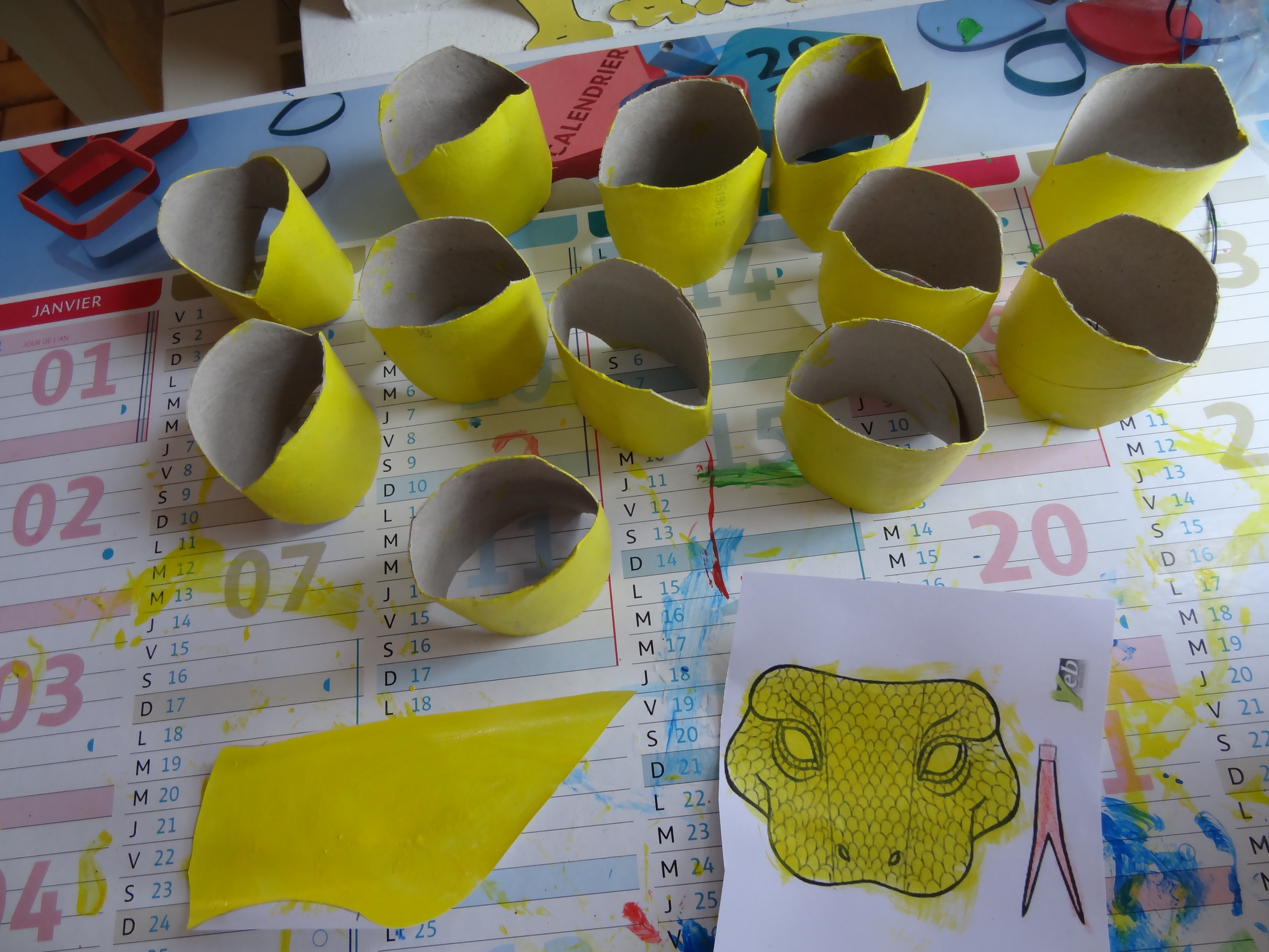 Ensuite, place à la peinture mais travail d'équipe! Et oui, je n'avais pas assez de rouleaux pour que chaque enfant puisse avoir son propre serpent donc que 2 seront réalisés...