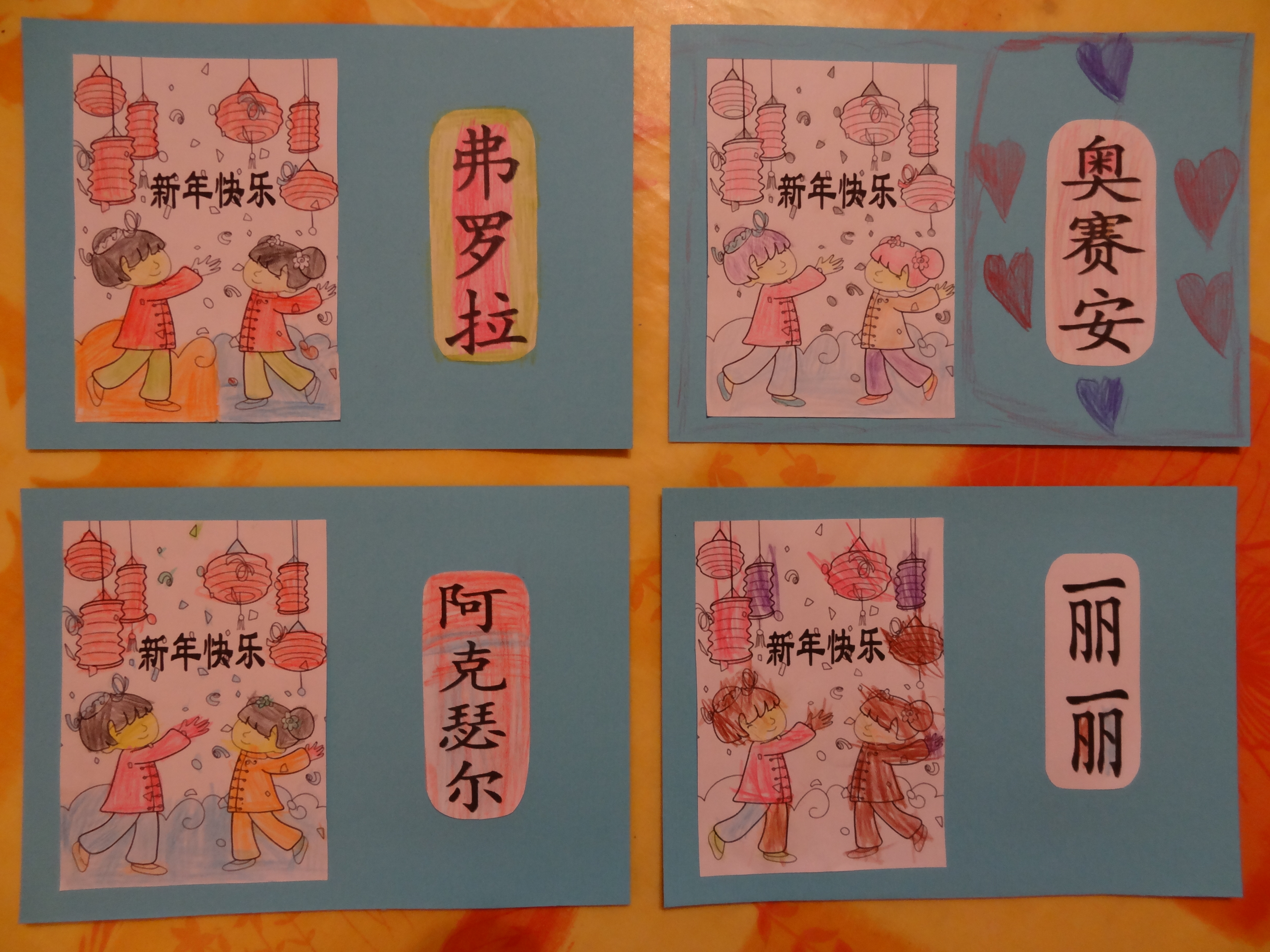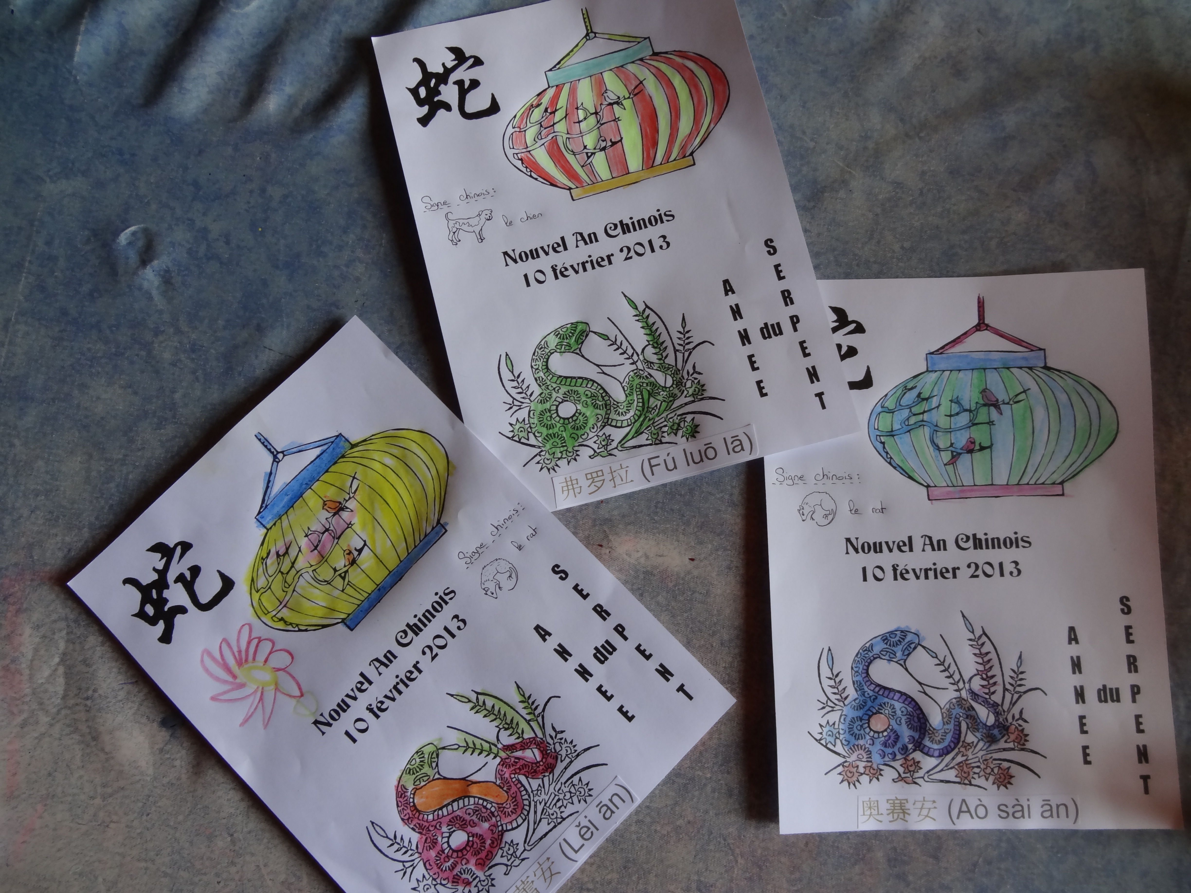 Les enfants ont fait une petite carte pour le nouvel an chinois en coloriant des dessins trouvé sur le net...