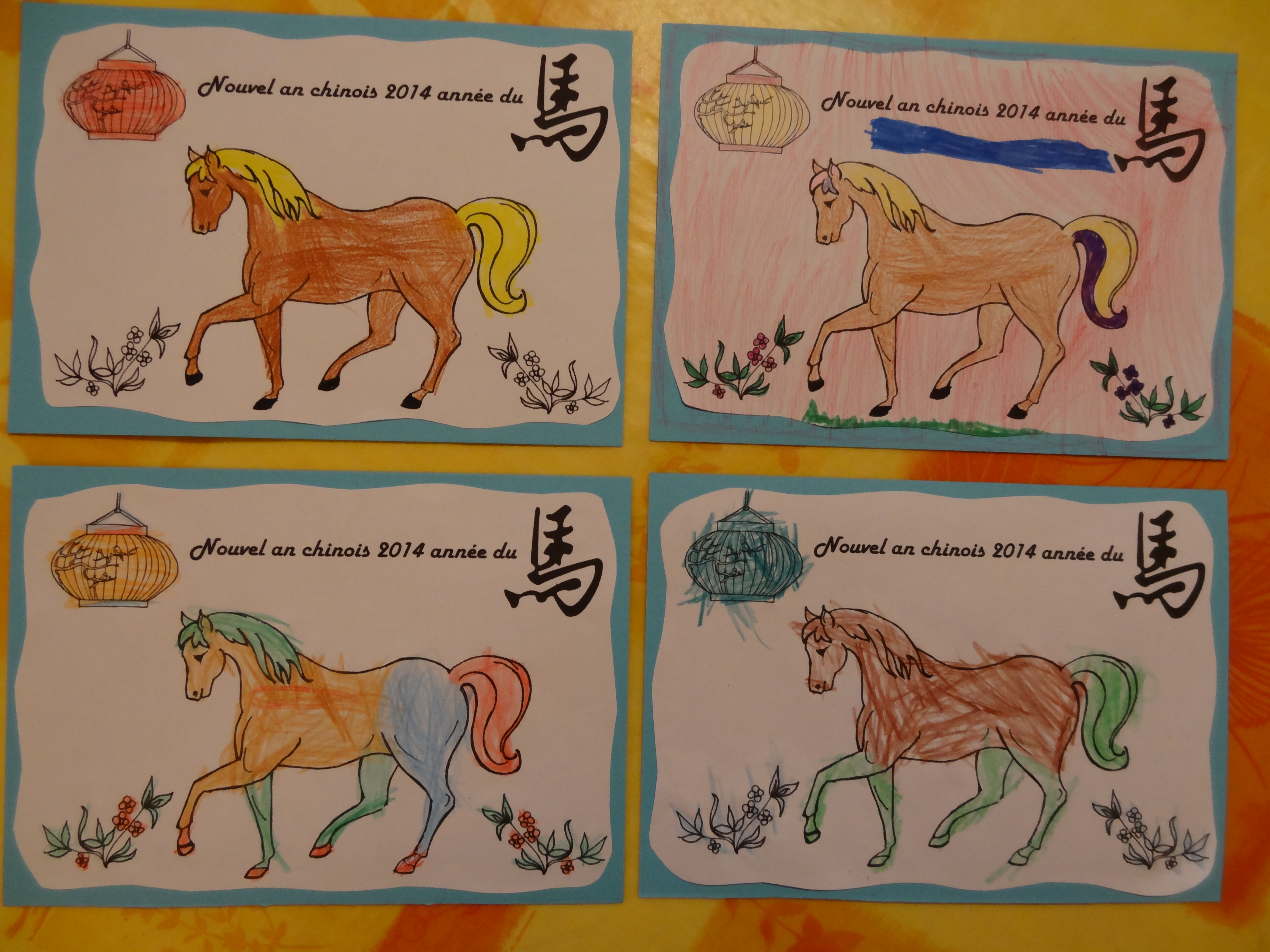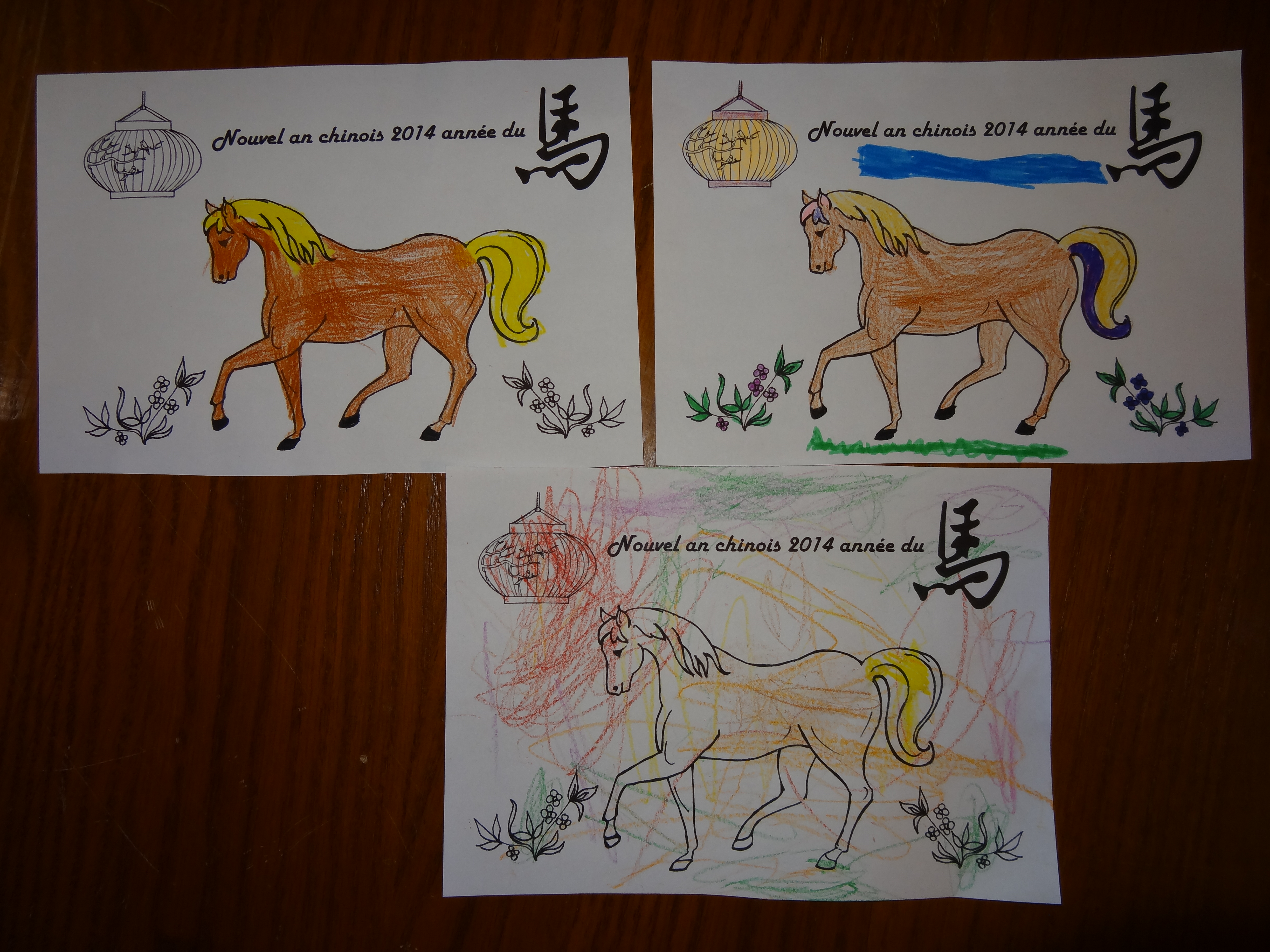 Voici les coloriages que les enfants ont fait pour le nouvel an chinois dont le signe à l'honneur cette année est le cheval de bois...